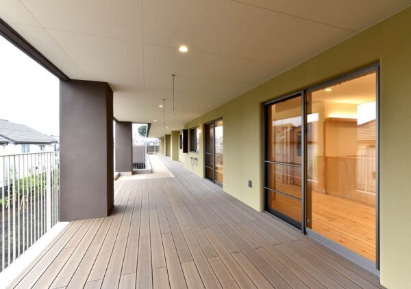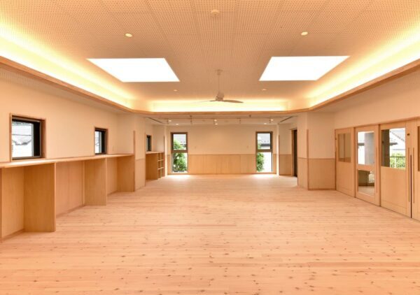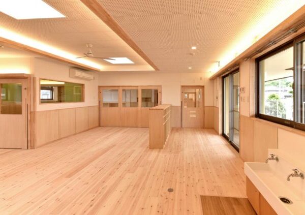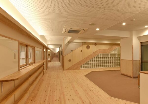 Integral Design Studio井上氏と共同設計。 0~1歳児室は園庭に近い1階、2~5歳児室 は2階に配置し、縁側や広いバルコニーを 介して内外をつなげた。厨房前の多目的スペースは延長保育やランチルームとして活用。 外観は住宅地になじむ茶系とし、内装は床・壁・建具に木を採用し温かみが感じられる園舎となった。